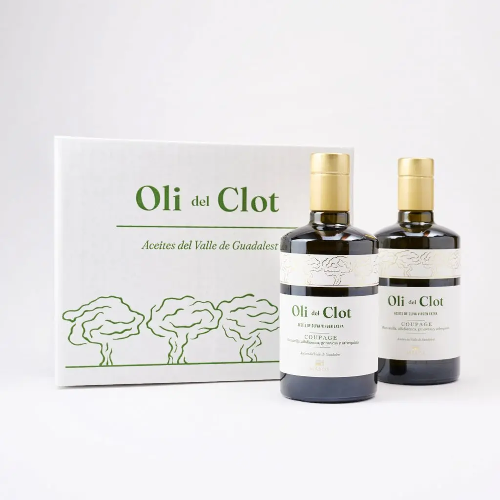 Pack of 6 bottles of 500ml. A coupage of the Alfafarenca, Manzanilla, Genovesa and Arbequina varieties. Excellent flavour with a sweet aroma, medium ripe fruity with notes of apple compote and toasted almond. A smooth oil with a sweet and dense entry and low to medium spiciness, with a good balance that leaves us with soft ripe nuances after tasting.