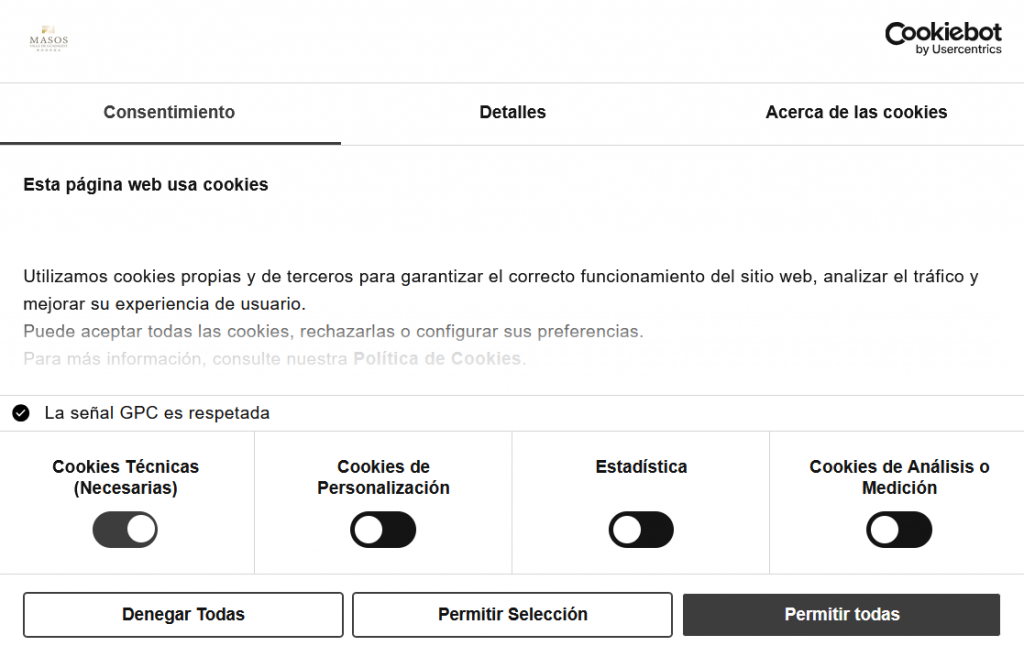 Este Sitio Web utilizamos cookies propias y de terceros para garantizar el correcto funcionamiento del sitio web, analizar el tráfico y mejorar su experiencia de usuario. Puede aceptar todas las cookies, rechazarlas o configurar sus preferencias haciendo click en los botones deslizantes.